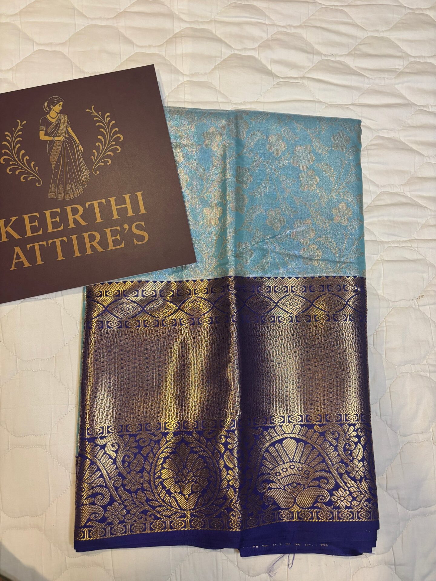 This image showcases a stunning blue and silver saree. The saree’s rich blue hue is accentuated by an intricate silver floral pattern that runs along its entire length, complemented by a thick silver border. The overall effect is one of understated elegance, perfect for special occasions or as a statement piece in any room.