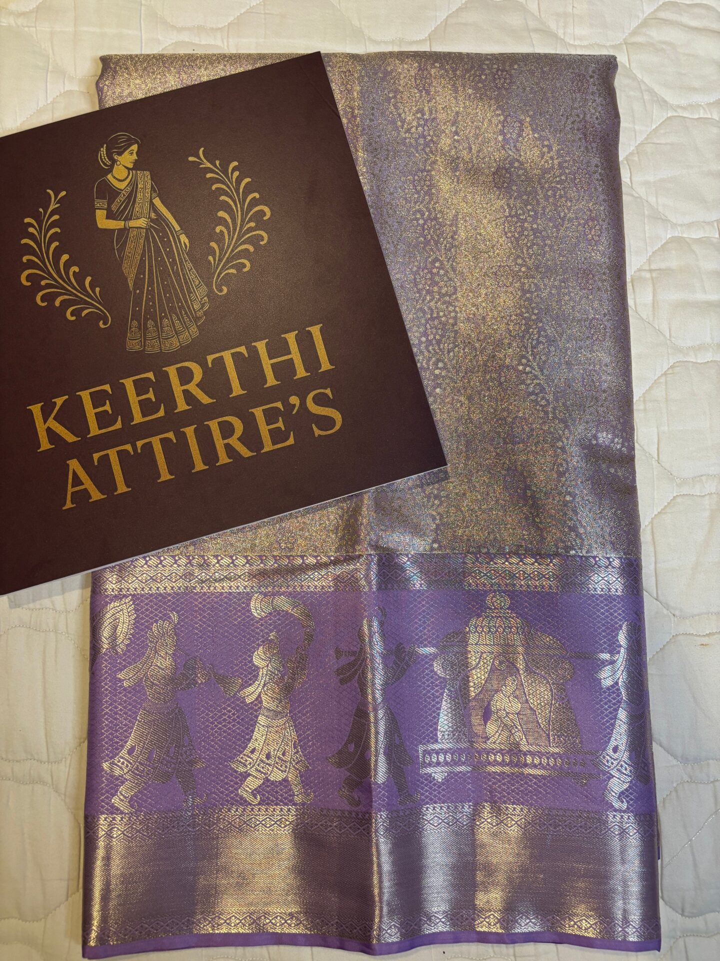 A stunning gold-purple tissue pattu saree with an intricate Palaki design border, elegantly folded and placed on a white surface, accompanied by a small potted plant, showcasing its traditional Indian charm.